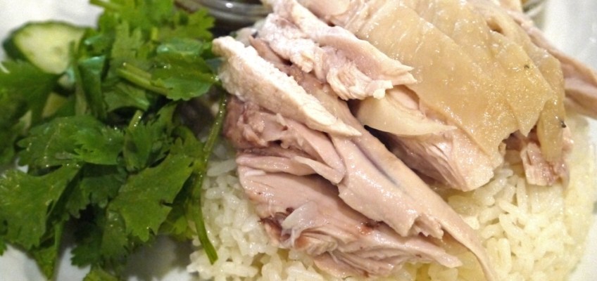 鶏の茹で汁を使用して炊き上げたご飯を鶏肉と共にスパイシーなソースで頂きます。